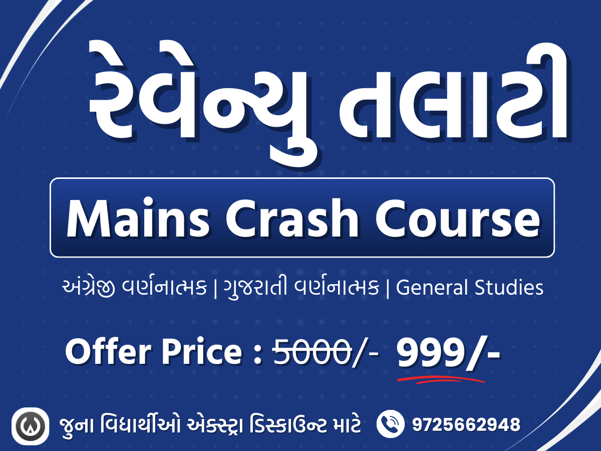 આ કોર્સમાં શું મળશે? Mains ના તમામ વિષયો 🔴 મુખ્ય પરીક્ષા (વર્ણનાત્મક) → Paper 1 : ગુજરાતી વર્ણનાત્મક → Paper 2 : English Language Skill → Paper 3 : સામાન્ય અભ્યાસ (Content Lectures Only) નોંધ : GS ના પ્રશ્ન-જવાબ માટે ઈ-બુક્સ આપવામાં આવશે. 🎁Free : Answer Writing Practice Program આ કોર્સ શા માટે ખાસ છે? 👉 રેકોર્ડેડ લેક્ચર્સ: ગમે ત્યારે, ગમે ત્યાં, ગમે તેટલી વખત જુઓ! 👉 ગુજરાતના સૌથી અનુભવી શિક્ષકો 👉 એકદમ અફોર્ડેબલ કિંમત આ કોર્સ કોના માટે છે ? 👉 જેઓ પહેલીવાર પરીક્ષાની તૈયારી કરી રહ્યા છે. 👉 જેઓ ઘરે બેસીને પોતાના સમયે શીખવા માંગે છે. 👉 જેઓ ઓછા સમયમાં મહત્તમ સફળતા ઈચ્છે છે. 📞 વધુ માહિતી માટે અમારો સંપર્ક કરો: 9725662948